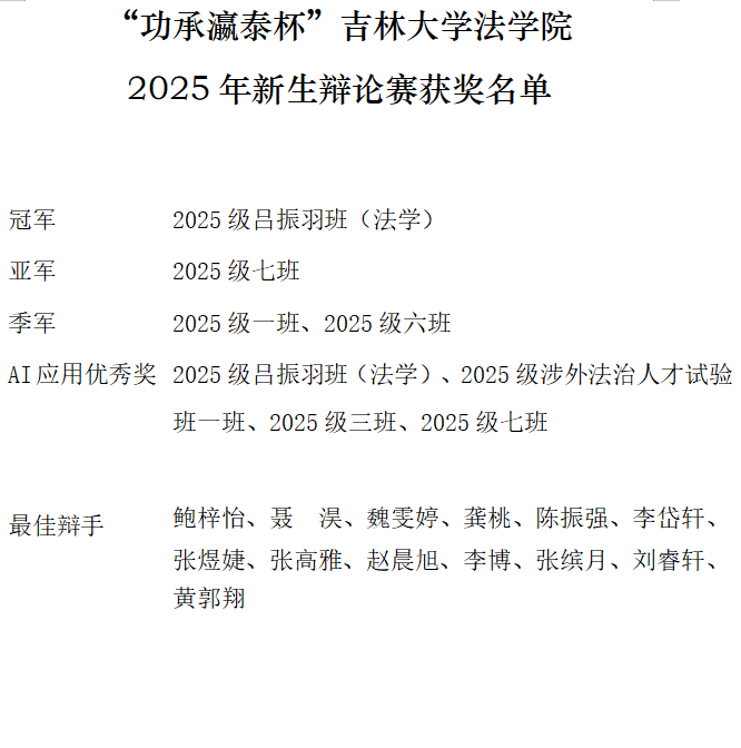 经过评委的投票,2025级吕振羽班(法学)获得冠军,2025级吕振羽班(法学)、2025级涉外法治人才试验一班,2025级三班,2025级七班获得AI应用优秀奖,鲍梓怡、聂淏获得决赛现场最佳辩手。
